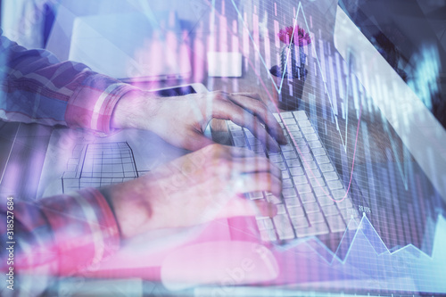 Double exposure of stock market chart with man working on computer on background. Concept of financial analysis.