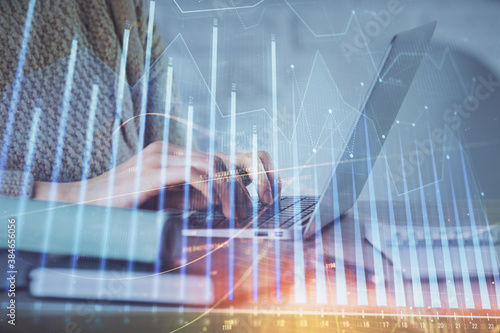 Double exposure of woman hands typing on computer and forex chart hologram drawing. Stock market analysis concept.