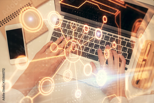 Double exposure of woman hands working on computer and social network theme hologram drawing. Top View. People connection concept.