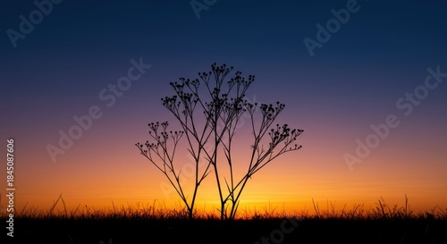 Dramatic landscape scene featuring the stark, dark outline of natural growth against a vibrant, colorful gradient sky at dawn or dusk ,dramatic ,field ,minimal