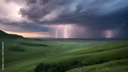 Dramatic Lightning Strike Over Lush Green Countryside on a Stormy Evening – Powerful Nature Photography