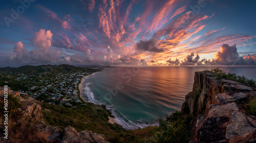 sunset, ocean, cliff, coast, town, village, beach, wave, cloud, sky, dramatic, colourful, orange, pink, blue, twilight, evening, landscape, scenic, view, panorama, aerial, tropical, island, coastline, sea, water, nature, travel, vacation, scenic view