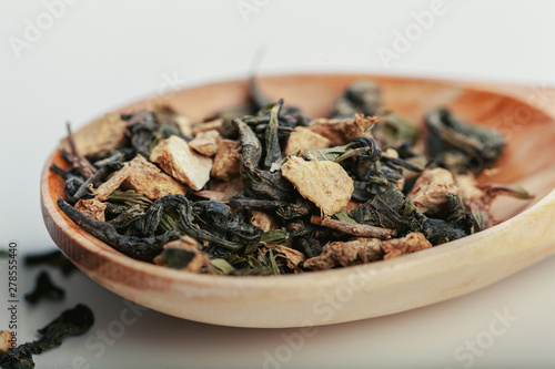 Dried tea leaves close up on white background