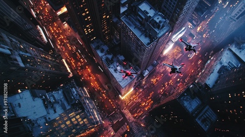 Drones capturing aerial footage of a city skyline at dusk, the streets below glowing with lights from cars and buildings.