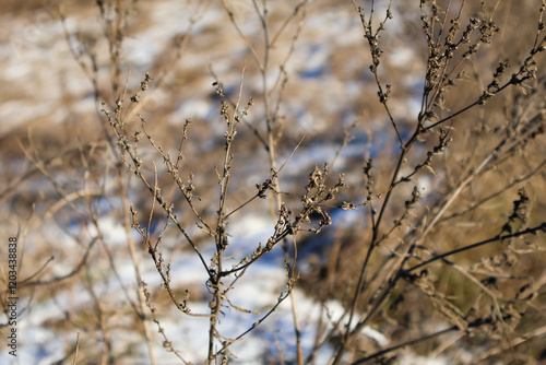 Dry plant stems with small buds in a winter field against a blurred snowy background. Nature and seasonal concept for outdoor design and print