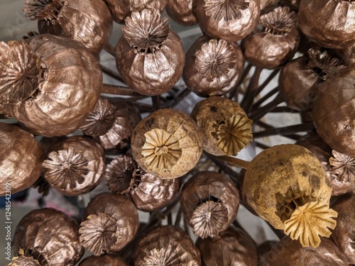 dry, bud, poppy, painted, shine, bronze, bouquet, creative, background, seed, design
