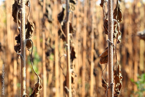 Dry stems of sunflower closeup. Sunflower field in the steppe zone of Ukraine. Sunflower is ripe and ready to harvest.