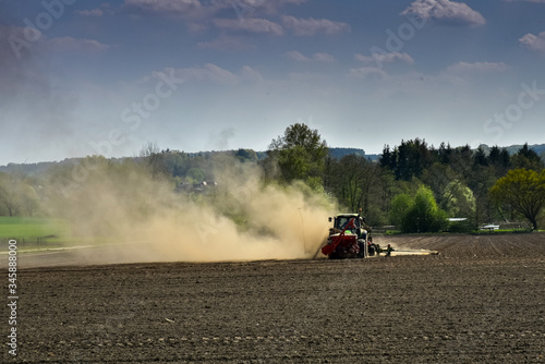 Dürre, Trockenheit, Staub, Trecker auf einem trockenen Acker, Feldarbeit, Wassermangel, kein Regen, ausgetrocknet