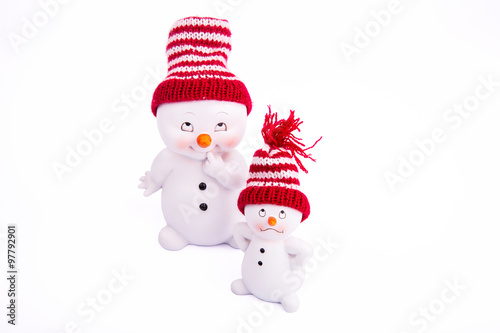 Два белых снеговика в шапках на белом фоне