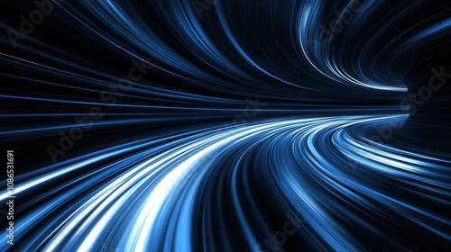 Dynamic blue light trails create futuristic tunnel effect, evoking speed and motion. abstract design suggests sense of movement and energy, with sleek, modern aesthetic