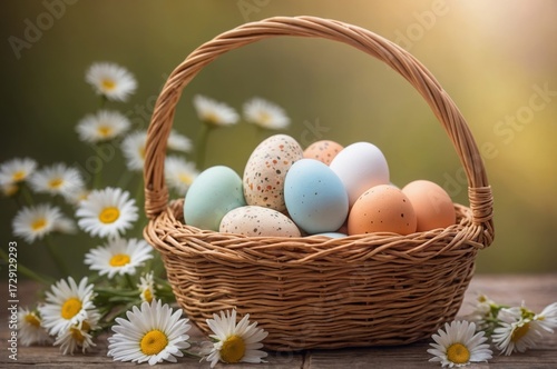 easter eggs in a basket, Wicker basket holds pastel-colored eggs in cream, peach, blue, and lavender shades. Some eggs feature speckled patterns.