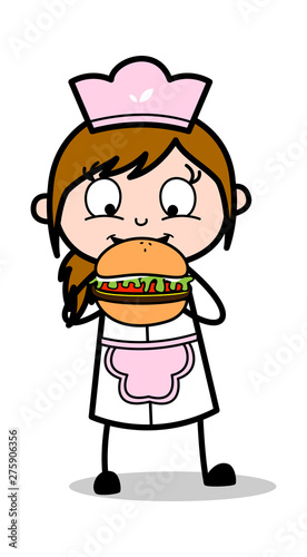 Eating Burger - Retro Cartoon Waitress Female Chef Vector Illustration
