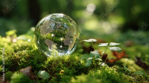 Ecology Concept: Crystal Earth Globe on Moss, Symbolizing Environmental Protection and Sustainable Future