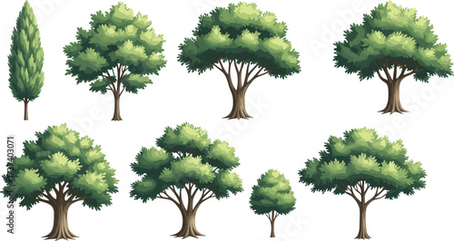 Eight illustrated trees with diverse foliage and trunk shapes, green canopy highlights, painterly style nature art for design and education