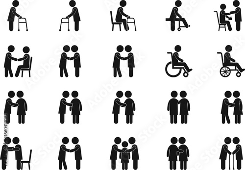 elderly, care, mobility, old, ageing, ageing, senior, people, silhouette, vector, illustration, health, health care, support, assistance, patient, nursing, retirement, pension, wellness, medicals, hospital, doctor, nurse, walking, stick, cane, wheelchair, disability, help, family, compassion, community, social, service, lifestyle, grandparent, aged, vulnerable, protection, rehabilitation, therapy, safety, treatment, clinic, well-being, humanitarian