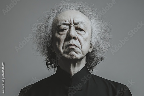 grey hair, portrait, wisdom, dignity, simplicity, posed, standing, monochrome, facial features, personality, individuality, character, expressive, mature, thoughtful, contemplative, emotional, serene, aged, studio shot, story, timeless, minimalism, stylish, presence