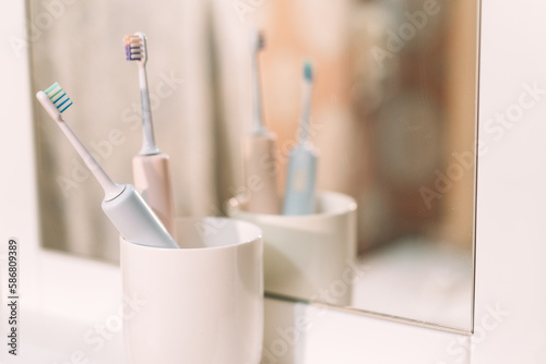 Electric toothbrushes blue and pink in glass in front of bathroom mirror.