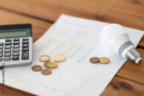 electricity, energy crisis and power consumption concept - close up of utility bill, calculator, money and lightbulb on wooden table