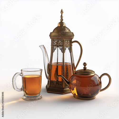 Elegant Arabian tea set with a glass teapot, ornate metal pitcher, and tea cup, isolated on white background for cultural decor