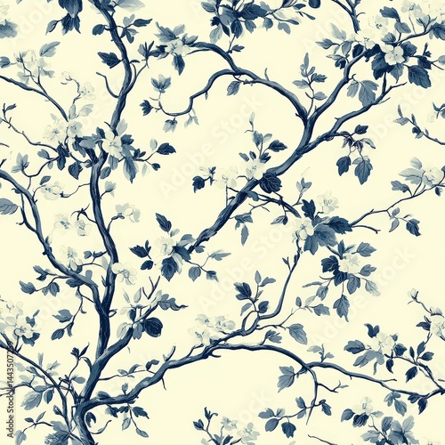 floral, pattern, design, blue, cream, tree branch, leaf, nature, wallpaper, fabric, artwork, botanical, print, illustration, decor, vintage, style, texture, seamless, artistic, natural, beauty, aesthetic, hand-drawn, detail, sophisticated, classic, surface, ornamental, home, environment, calmness, elegance, textile, interior, refined, background, visual, graphic, motif, statement, arrangement, charme, decoration, simplicity, intricate, inspiration, bloom, organic