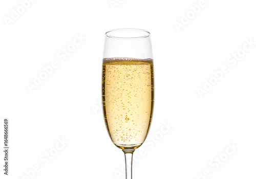 Elegant champagne flute filled with sparkling champagne on black background