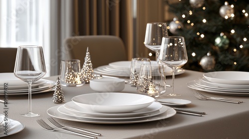 christmas, table, setting, elegant, dinner, plate, silverware, glassware, wine, goggles, holiday, festive, decor, home, interior, room, tree, light, ornament, candle, white, silver, beige, dining, food, celebration, party, family, gathering, design, style, luxury, modern, winter, season, event, occasion, background, scene, image