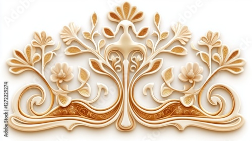 art, design, floral, cream, gold, ornate, elegant, pattern, symmetric, flower, leaf, swirl, vine, branch, sculpture, relief, carving, intricate, detailed, craft, artistry, decoration, embellishment, motif, element, style, aesthetic, antique, vintage, classic, traditional, luxurious, texture, background, wallpaper, image, illustration