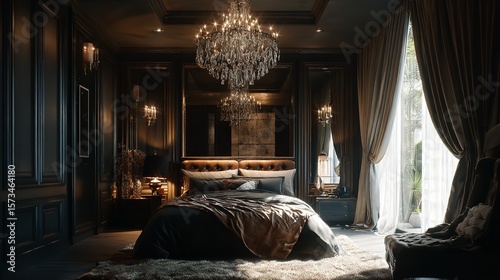 Elegant dark bedroom interior with crystal chandelier and soft furnishings