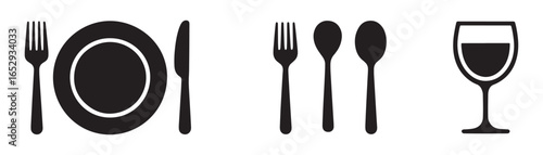 dining, food, cutlery, plate, fork, knife, spoon, wine glass, eatery, catering, icon, silhouette, tableware, utensil, eat, drink, glassware, meal, dinner, lunch, black, isolated, graphic, design, symbol, logotype, clip art, vector, illustration, signs, cookery, set, simple, modern, shape, empty, clean, elegant