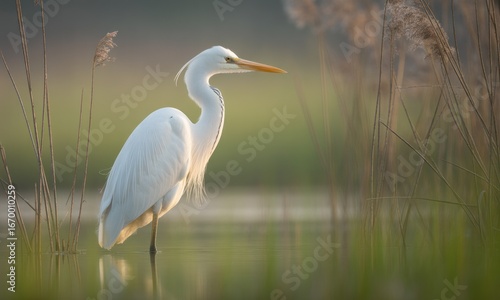 egret, heron, bird, wildlife, nature, water, marsh, reed, sunlight, profile, white, feather, long, beak, graceful, still, quiet, morning, sunset, shallow, calm, sharpened, detail, beauty, tranquil, photo, conservation, environment, species, ornithology, avian, wading, hunting, duck pond, grass, plant, gold, lighting, soft, blurred, background, silhouette, horizontal