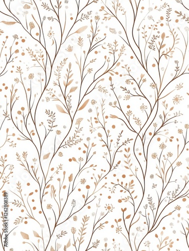 Elegant floral pattern with brown and gold branches and leaves on a white background. Perfect for textile design, wallpaper, or packaging.