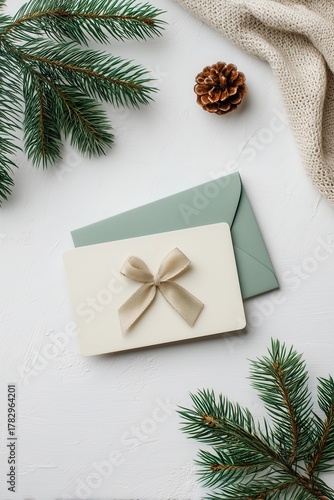 gift, card, bow, envelope, festive, elegant, pine, tree branch, christmas, holiday, decoration, ribbon, wrapping, present, white, green, background, texture, cone, cosy, knit up, fabric, greeting, celebration, season, stylish, composition, element, simplicity, minimalistic, posh, decor, winter, note, message, mail, communication, tradition, stationary, leaf, invitation, exchange, surprise, delicate, craft
