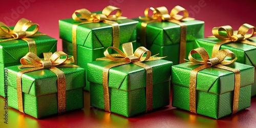 Elegant Green Gift Boxes with Gold Bows on Red Background - Festive Holiday Packaging