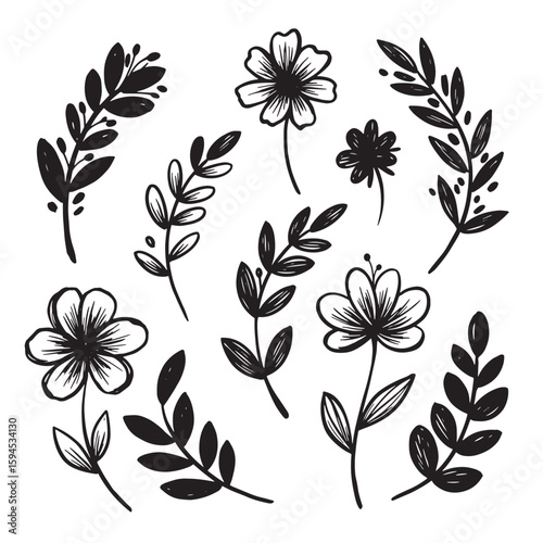 Elegant hand drawn floral and foliage elements in black and white for design projects