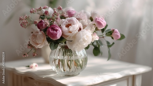 Elegant Home Decor with Fresh Flowers in a Transparent Glass Vase on a White Table in a Bright Minimalist Living Room
