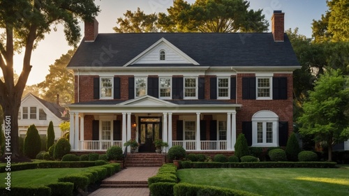 Elegant luxury suburban house exterior with classic colonial architecture surrounded by lush green lawn and beautiful landscaping features