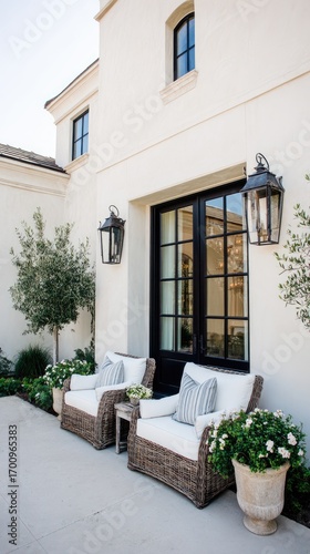 patio, seating, chair, wicker, white, black, plant, stone, light, design, decor, elegant, modern, classic, simple, calm, peaceful, house, exterior, garden, furniture, lantern, window, grey, blue, textile, porch, comfortable, beautiful, colourful, bright, creative, stylish, professional, decorative, vibrant, stunning, amazing, marvellously, fantastic, gorgeous, lovely, charming, attractive