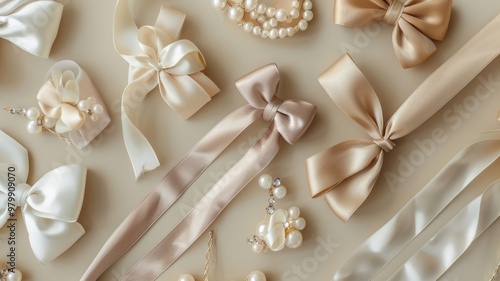 Elegant Pearl Hair Accessories and Ribbons on Beige Fabric