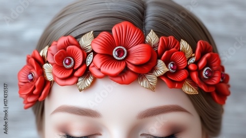 headband, floral, red, elegant, accent, accessory, fashion, style, flower, feminine, decorative, gem, gem, design, beauty, ornate, trendy, vibrant, chic, headwear, detail, glam, bold, stylish, craft, hand-made, luxurious, contemporary, striking, chaplet, dynamic, exquisite, beautiful, intricate, statement, headpiece, boutique, creativity, flower petals, leaf, texture, adornment, embellishment, headgear