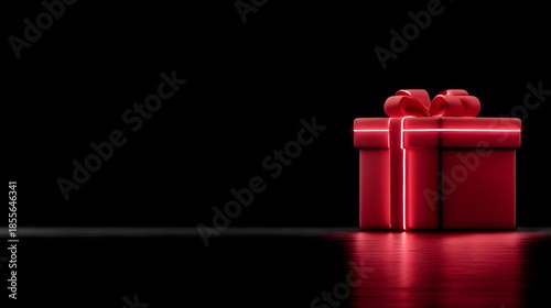 Elegant red gift box with glowing neon light on dark background with copy space