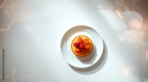 Elegant strawberry raspberry tart on white plate with futuristic overlay