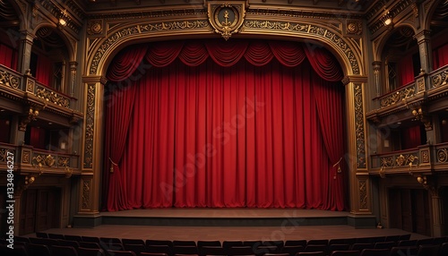 stage, curtain, theatre, red, closed, performance, balcony, balustrade, architecture, building, ornate, decorative, pattern, gold, art, design, interior, indoor, nobody, seat, row, empty, classic, vintage, luxury, grand, old, historical, drama, show, scene, presentation, entertainment, culture, artwork, theatrical, setting, artistic, rendering