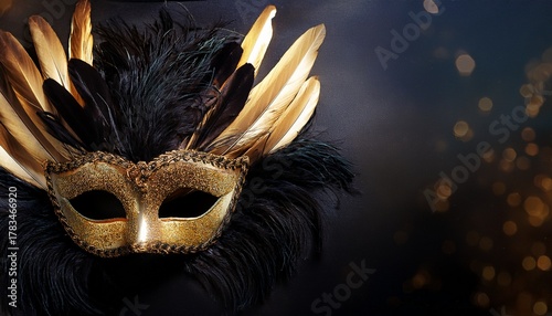 elegant venetian mask gold black feathers dark background for masquerade party invitation