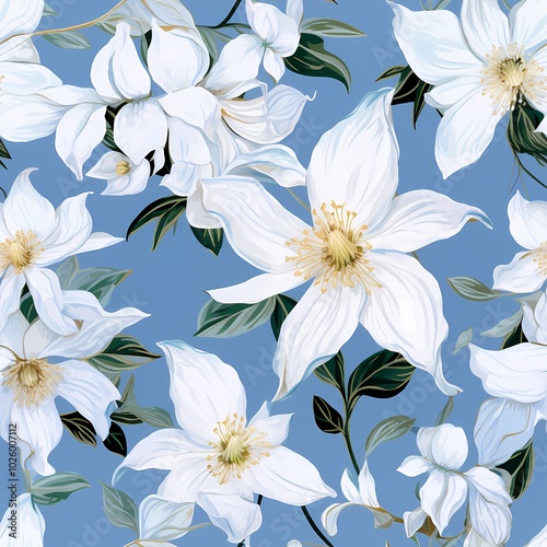 Elegant white flowers with green leaves on a deep blue backdrop for a sophisticated look.