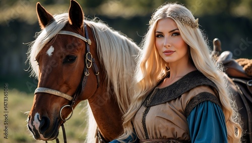 beautiful woman, horse, fantasy, elegance, nature, equestrian, portrait, fairy tale, whimsical, regal, femininity, horseriding, fantasy art, soft light, serene, graceful, enchanting, adventure, knight, countryside, long hair, beauty
