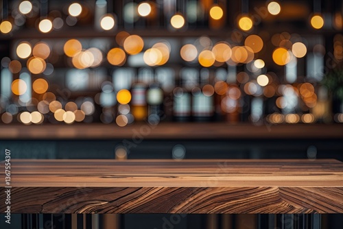 Elegant Wood Tabletop with Refined Bokeh Bar Atmosphere for Premium Product Display
