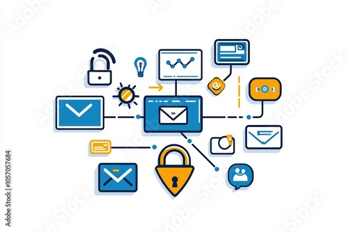 Email communication concept with security icons, digital symbols, isolated on white.