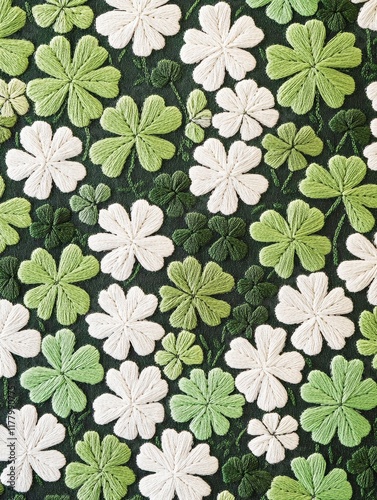 Embroidered Shamrocks in Green and White on Fabric or Carpet - Decorative Design for St. Patrick's Day