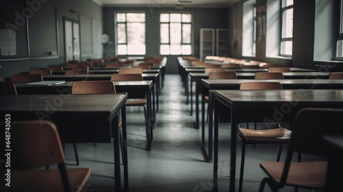 Empty Classroom of Tables, Chairs, and a Blackboard, with a Subtle Blurred Background.