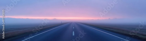 Empty highway stretching into a misty horizon at dawn, creating a sense of anticipation and mystery, Misty Highway, Morning Journey